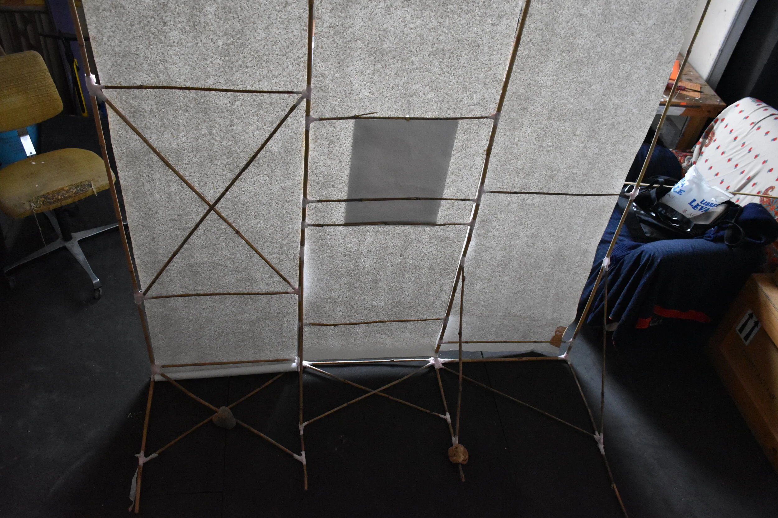 Screen (bamboo cane, low-tack masking tape, pebbles, wallpaper, bulldog clips) supporting Woodchip, Canton, oil on canvas, Lara Davies, 2017
